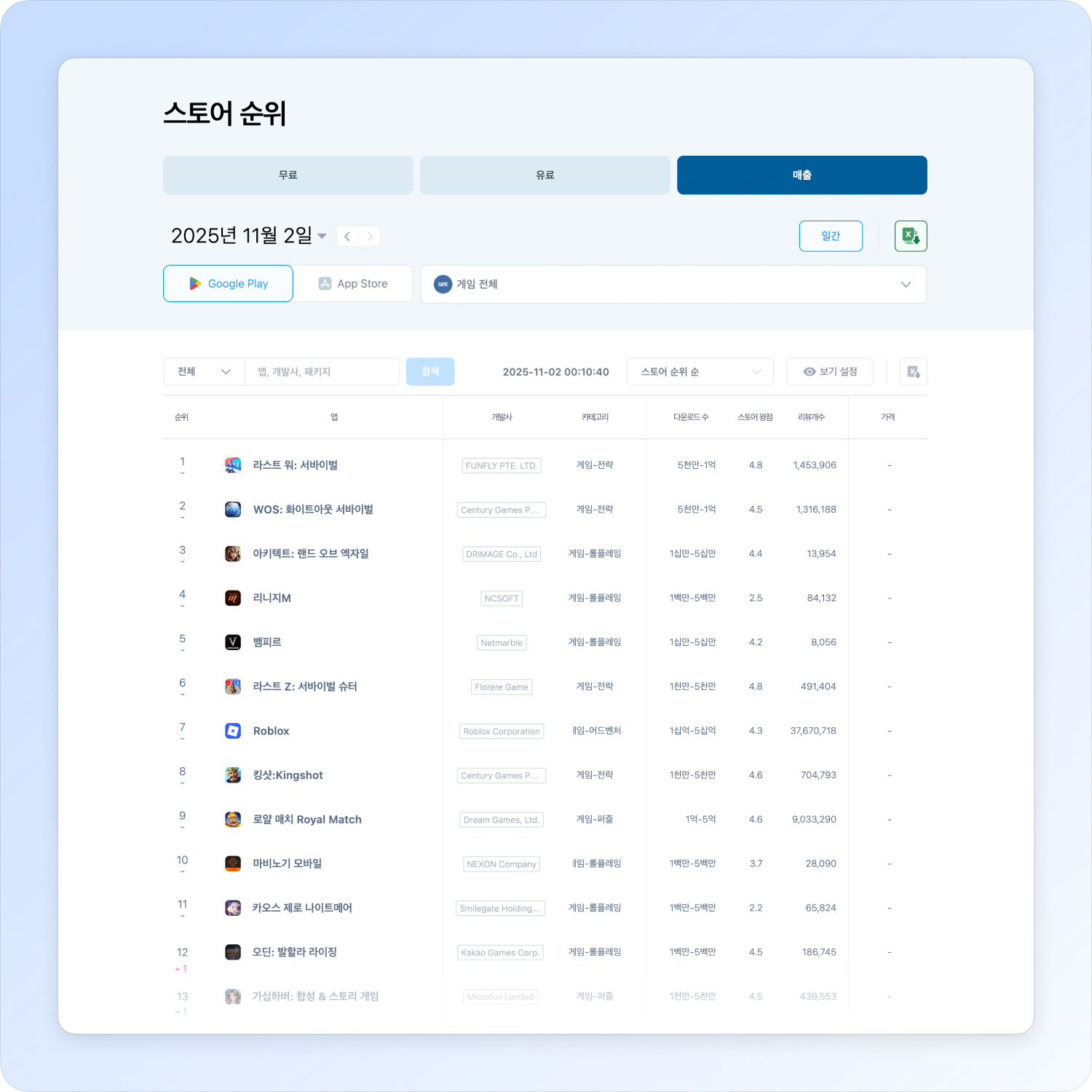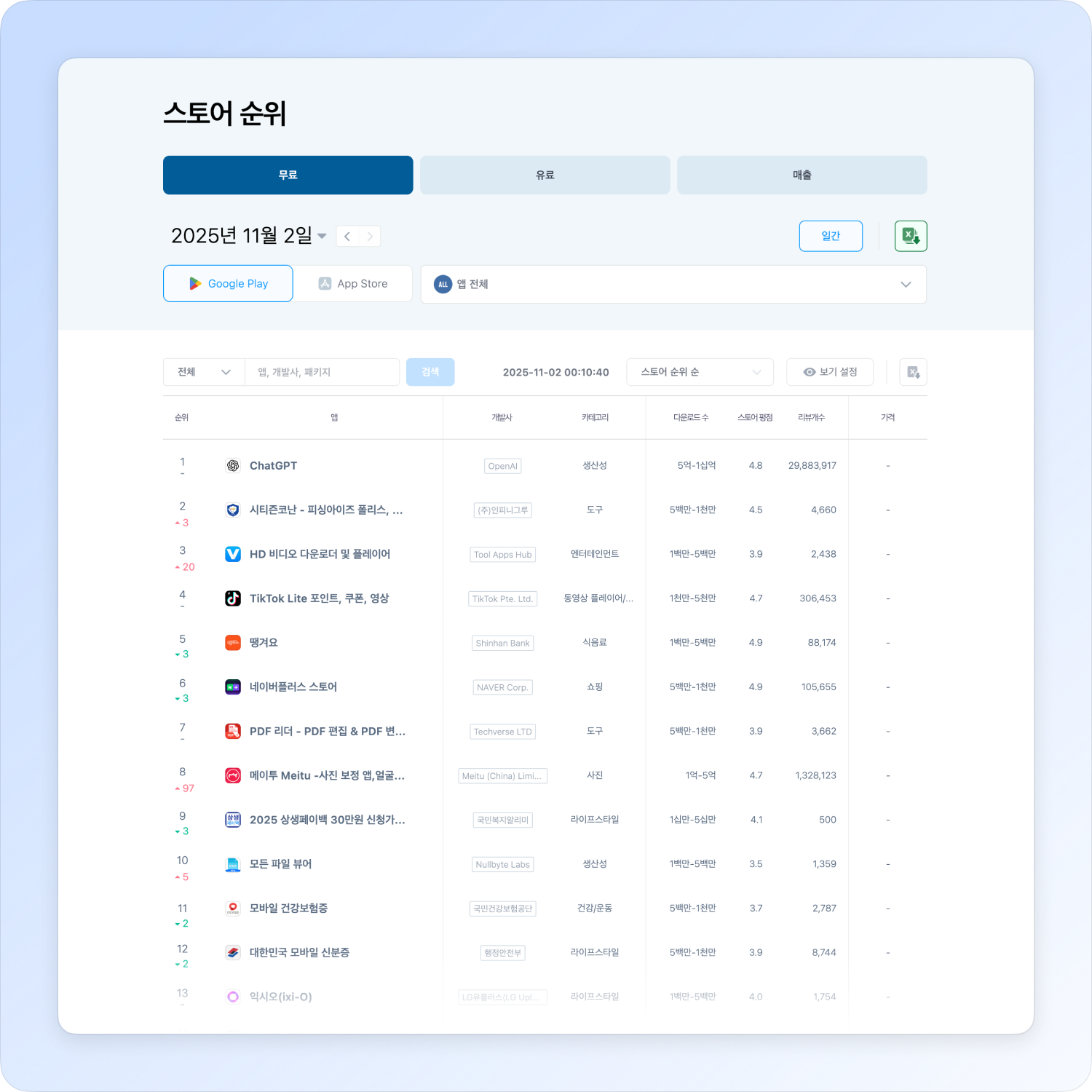 You can compare and analyze app download performance using various filters such as period, store, and category. If you select “View newly entered rankings” in the view settings, you can check the free apps that newly entered the rankings during the selected period.
